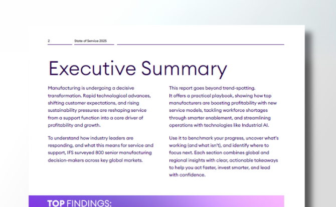 Download the State of Service 2025: Manufacturing Transformation Report to benchmark your strategy, explore regional comparisons, and uncover insights on servitization, Industrial AI, workforce shortages, sustainability, and supply chain resilience.