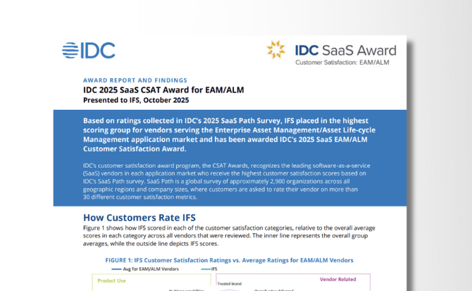 IFS was founded in 1983 by five university friends who pitched a tent outside our first customer's site to ensure they would be available 24/7 and the needs of the customer would come first. Since then, IFS has grown into a global leader with over 7,000 employees in 80 countries. Driven by those foundational values of agility, customer-centricity, and trust, IFS is recognized worldwide for delivering value and supporting strategic transformations. We are the most recommended supplier in our sector. Visit ifs.com to learn why.