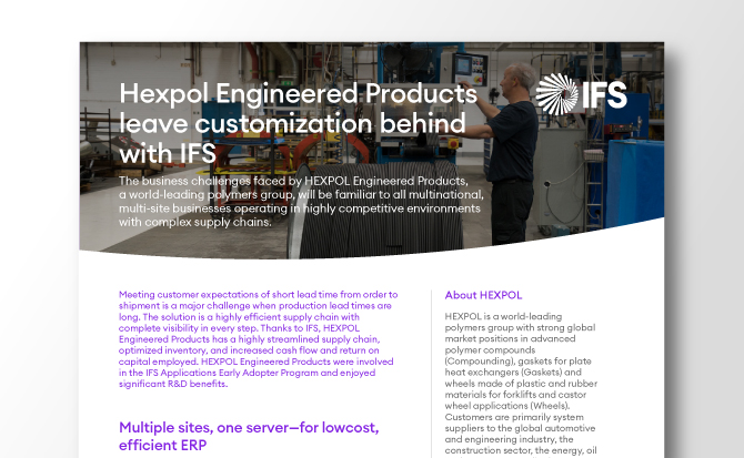 The solution is a highly efficient supply chain with complete visibility in every step. With IFS, HEXPOL Engineered Products has a highly streamlined supply chain, optimized inventory, and increased cash flow and return on capital employed.