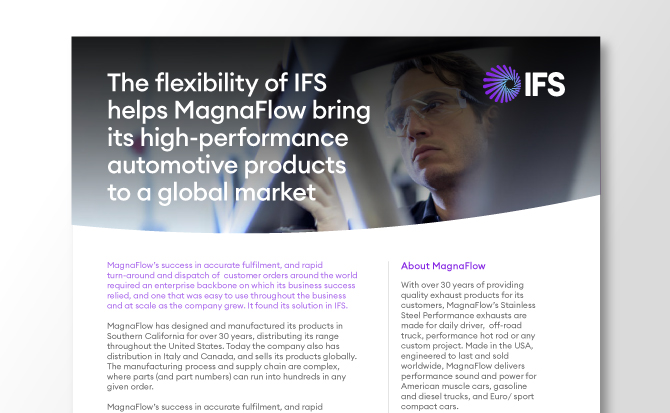MagnaFlow, a global manufacturer of high-performance automotive parts, was in need of an easy-to-use, scalable enterprise software solution that could grow with the business, as well as enable accurate fulfillment and rapid turn-around and dispatch of customer orders. For MagnaFlow, the solution was IFS.